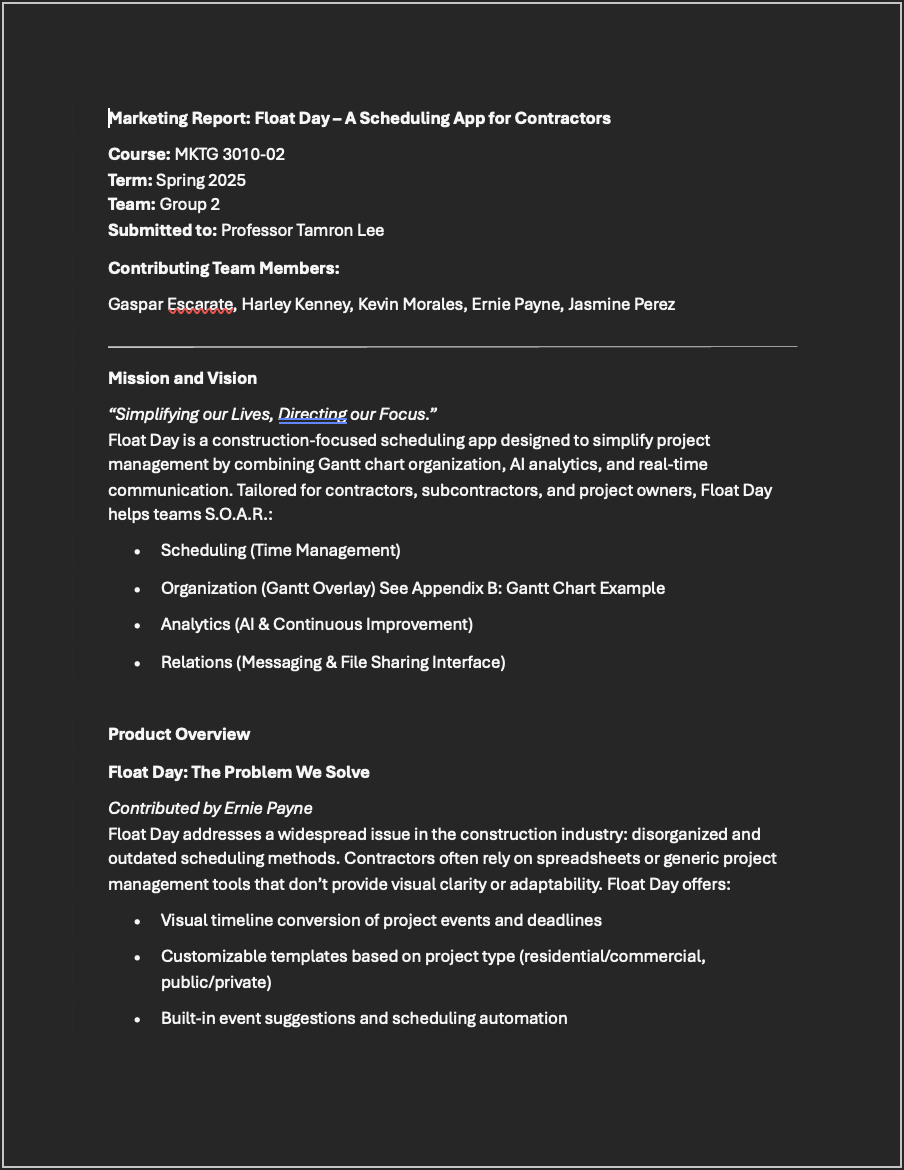 Float Day is a concept scheduling app created in a marketing course at Utah Tech. Designed for contractors, it features Gantt charts and planning tools to improve project organization. The project focused on market research, strategy, and collaboration, helping me develop skills in competitive analysis and product development.